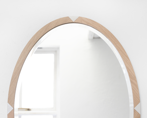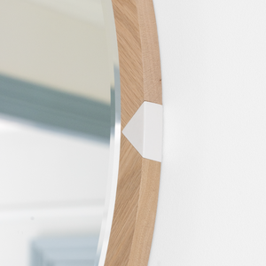 Four pieces of solid European Oak come together, with the grain of each piece angled away from its neighbour, to create the Ovolo's mirror frame.