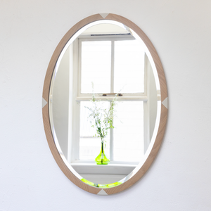 Born from a love of streamlined forms and heritage design elements, The Ovolo is an elegant modern mirror. Made of solid European Oak with hand-painted lacquer triangles, this contemporary heirloom is fitted with low iron mirror glass with a choice of a plain or 15mm bevel edge.